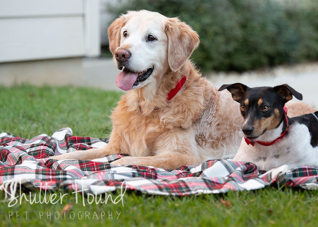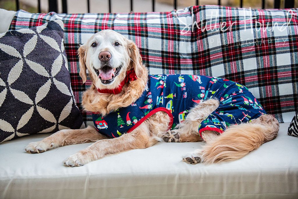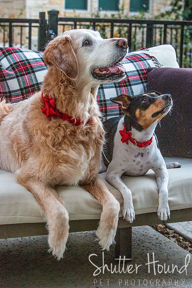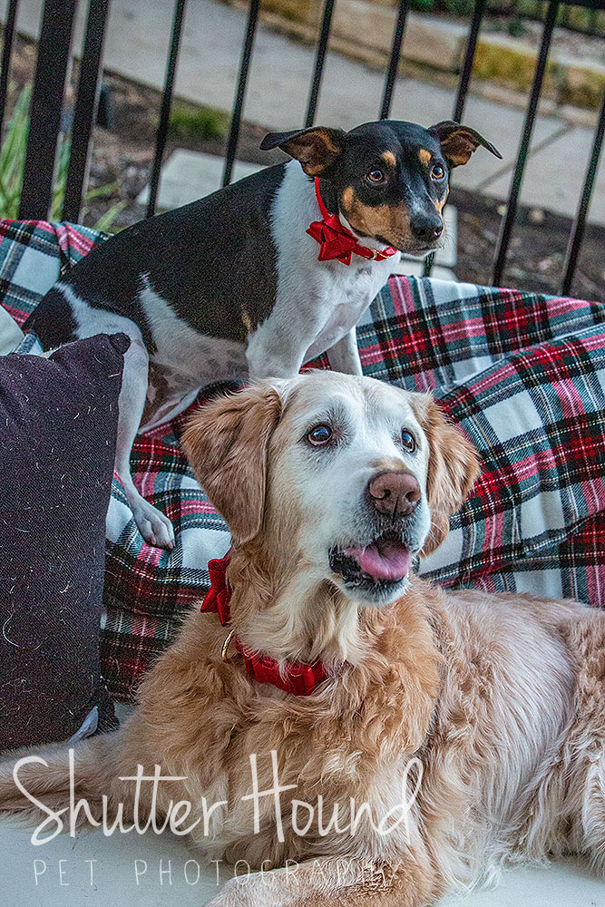 I had the pleasure of photographing a 12-year- old Golden Retriever named Bentley and a 1.5-year-old Decker Rat Terrier named Olive. They are an unlikely pair but are so bonded and bring out the best in one another. It was very clear that Olive keeps Bentley young and spritely. We focused on some portraits of them and general, as well as some specifically for a holiday card. I loved seeing their dinosaur costumes – sooooo stinking cute! These two were an absolute pleasure to photograph and you can tell how much they adore one another, too.