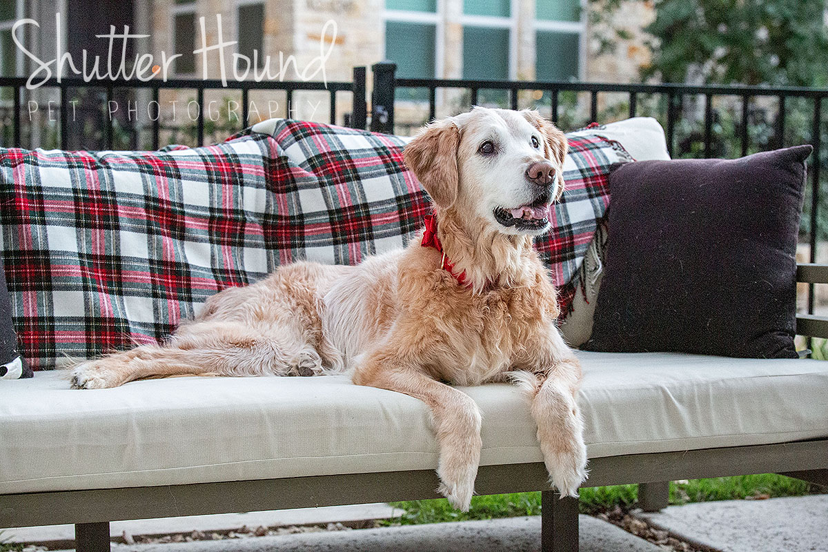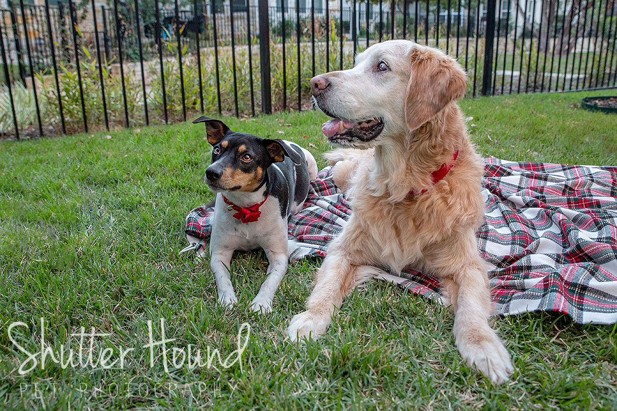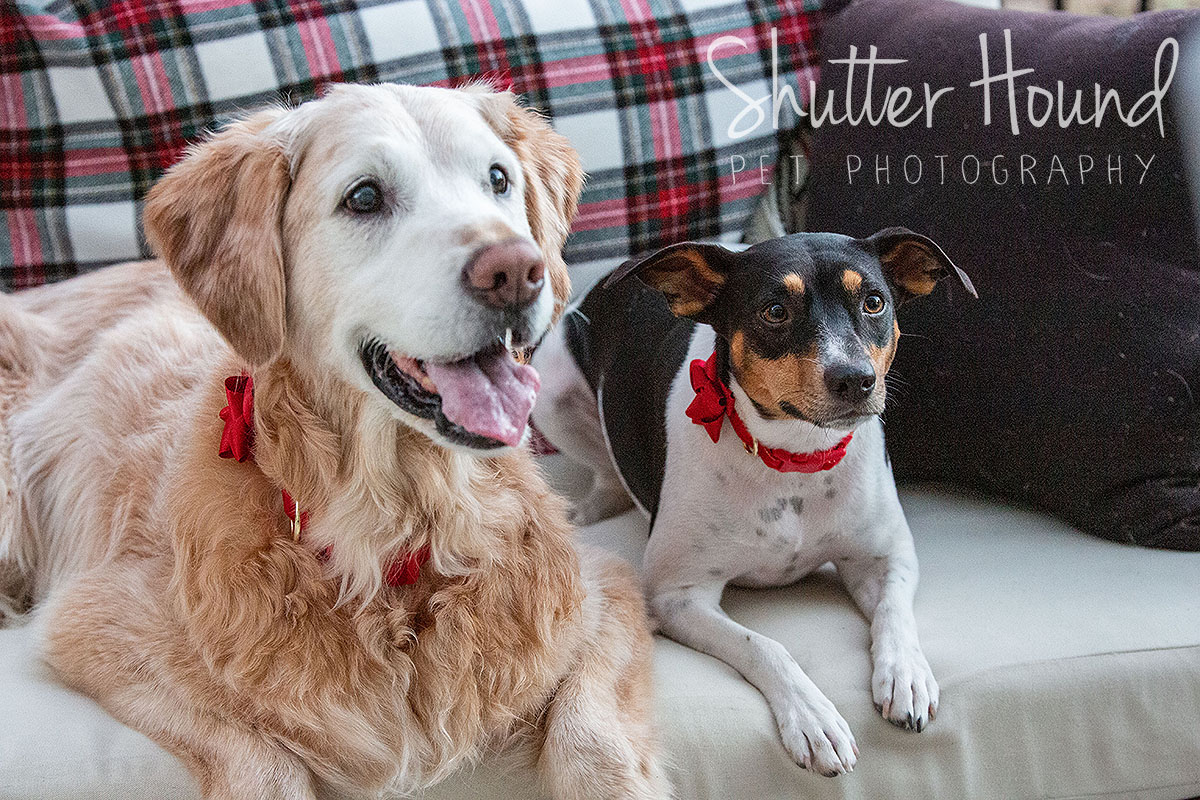 I had the pleasure of photographing a 12-year- old Golden Retriever named Bentley and a 1.5-year-old Decker Rat Terrier named Olive. They are an unlikely pair but are so bonded and bring out the best in one another. It was very clear that Olive keeps Bentley young and spritely. We focused on some portraits of them and general, as well as some specifically for a holiday card. I loved seeing their dinosaur costumes – sooooo stinking cute! These two were an absolute pleasure to photograph and you can tell how much they adore one another, too.