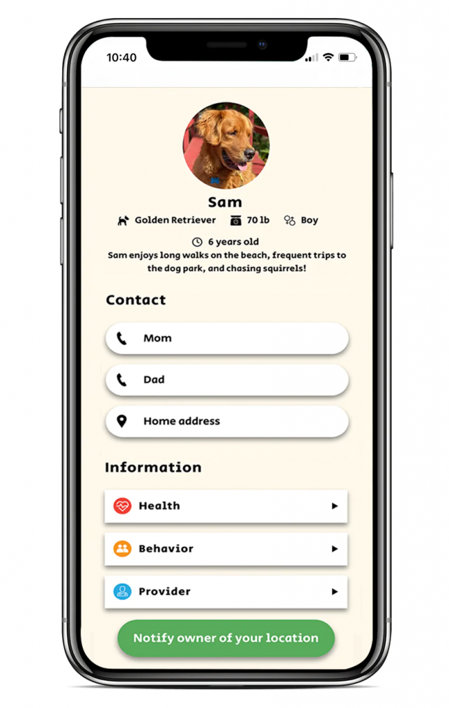 The ByteTag pet profile displays all the information necessary to get your pet home safely, like: