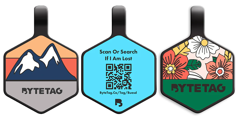 ByteTag is a scannable pet tag containing all of your pet’s important information conveniently in one profile. The profile can be viewed using a QR code located on the back of the pet tag or typing in the unique URL link associated with the QR code. It is a one-time purchase, no subscription is necessary. They work with any smartphone, are 100% waterproof, and come in a variety of designs, too!