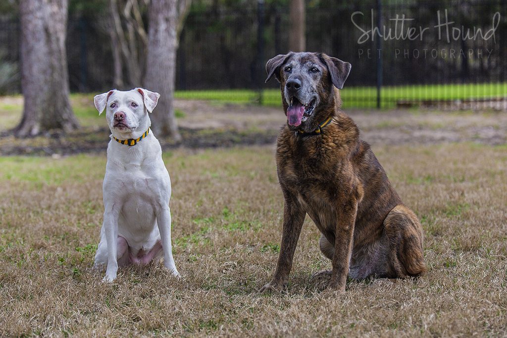 Meet Ranger, the brindle Plott Hound, and Arrow, the white lab-pit mix! Ranger is a 12-year-old gentle giant and Arrow is a 9-year-old very sweet but bossy lady. Ranger loves to play with toys and lights up with positive praise. Arrow gets the zoomies and loves to lie in the sun and cuddle up near the fire. We had a fun Together Session where we got some more posed photos and some cute candids, as well. These two were so good! Their mom, Abby, has done some training with them and it certainly came in handy! They knew the “watch me” command and would look right at Abby, who just so happened to be standing right next to me! They seemed to have a good time and got lots of treats and playtime with toys during our session.