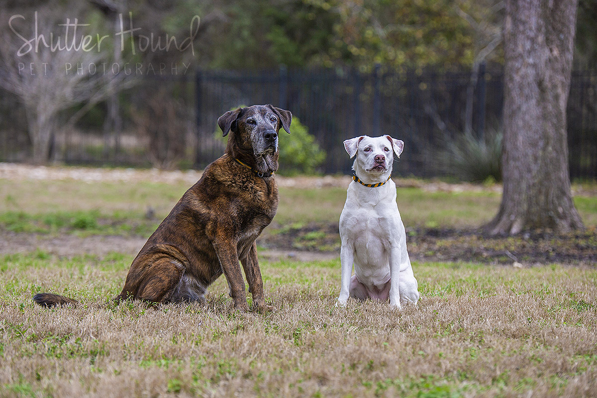 Meet Ranger, the brindle Plott Hound, and Arrow, the white lab-pit mix! Ranger is a 12-year-old gentle giant and Arrow is a 9-year-old very sweet but bossy lady. Ranger loves to play with toys and lights up with positive praise. Arrow gets the zoomies and loves to lie in the sun and cuddle up near the fire. We had a fun Together Session where we got some more posed photos and some cute candids, as well. These two were so good! Their mom, Abby, has done some training with them and it certainly came in handy! They knew the “watch me” command and would look right at Abby, who just so happened to be standing right next to me! They seemed to have a good time and got lots of treats and playtime with toys during our session.