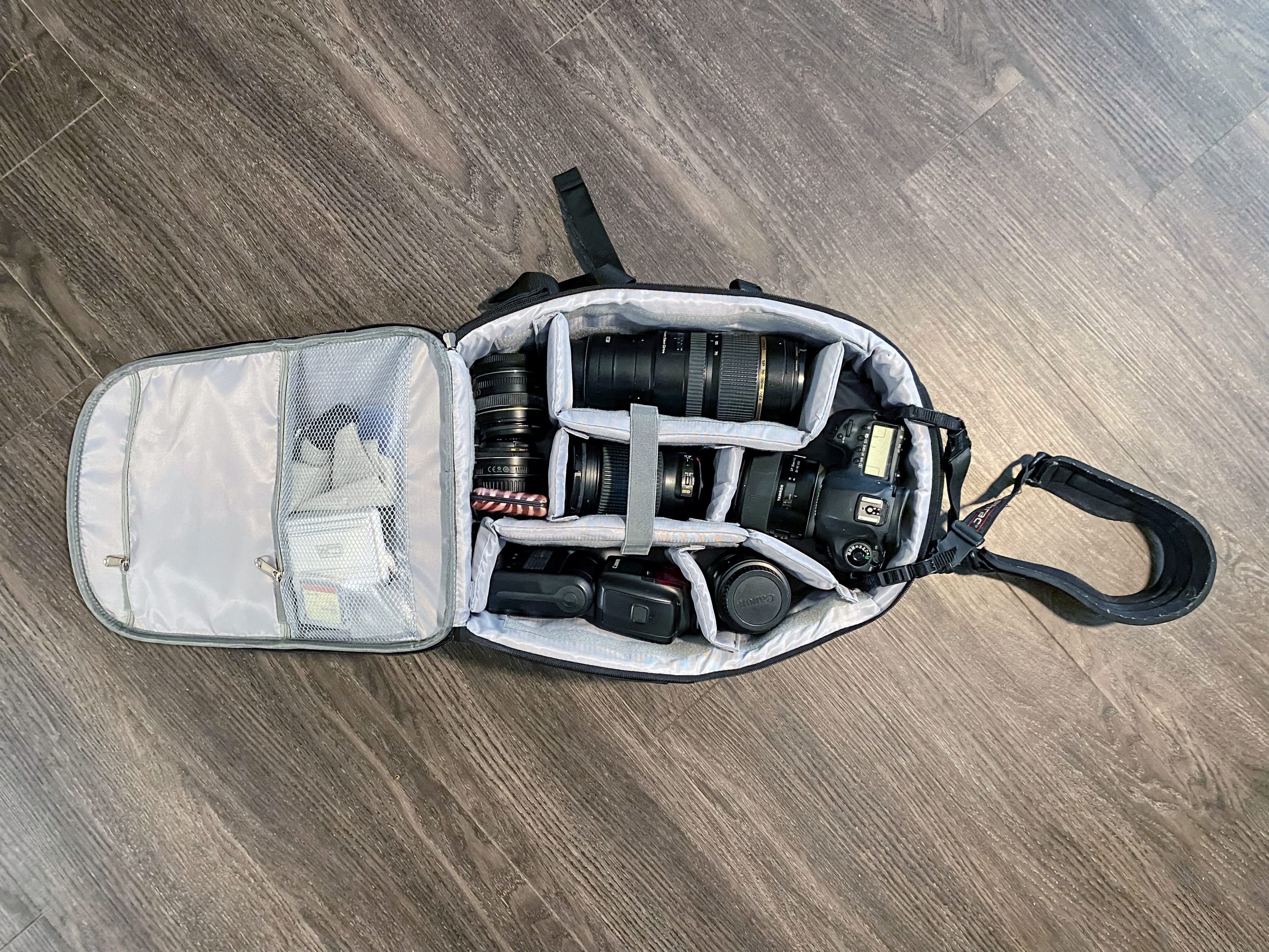 That is the main equipment I carry with me, but I also have things like extra lens caps, cleaning supplies, memory cards, pens, business cards, and an extra battery. I do have a tripod, but I don’t usually bring that unless I know I need it or plan something specifically that’ll require it. I also have a crop sensor body as a backup, but that doesn’t live in my bag either.